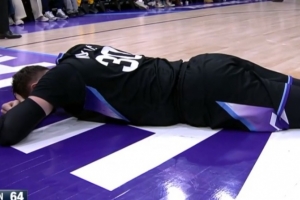见红了!努尔基奇抢篮板被扫到脸部 眉角被打开鲜血直流