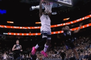 挺身而出!爱德华兹防守端干扰对方三分 反击折叠暴扣2+1打回悬念