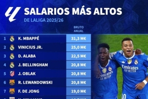 本赛季西甲球员年薪:姆巴佩3130万欧居首,维尼修斯2500万欧次席