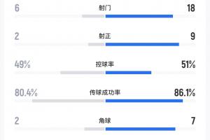 体育资讯01月25日讯 今晚亚洲杯决赛,U23国足0-4不敌日本,全场数据如图。射门数6-18、射正2-9、控球率49%-51%。