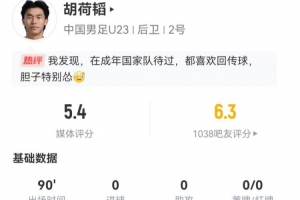胡荷韬本场1射+5长传0成功 3解围2拦截2抢断+2造犯规 6对抗4成功