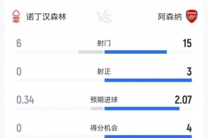 抓不住机会!阿森纳0-0森林数据:射门15-6射正3-0,得分机会4-0