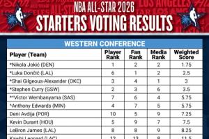 全明星首发投票详情:西SGA媒体第1&约基奇球员第1 东CC球员第1