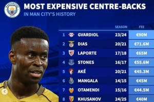 德转列曼城中卫引援榜:格瓦迪奥尔9000万最贵,格伊仅第12