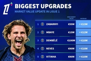 法甲球员身价上涨榜:扎巴尔尼+1300万欧居首,登贝莱+1000万欧