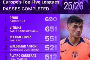 24直播网讯 根据Squawka统计,巴萨中场佩德里以690次传球领跑本赛季欧洲五大联赛球员传球榜。巴黎的维蒂尼亚以651次位列第二,巴黎FC的马克西姆-洛佩斯(551次)和多特的安东(521次)分列三、四位。皇马的B费、勒沃库森的加西亚等球员也跻身前十。