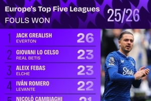 24直播网讯 25/26赛季欧洲五大联赛被犯规次数榜出炉,埃弗顿的格拉利什以26次高居榜首。紧随其后的是贝蒂斯的洛塞尔索与埃尔切的阿莱士-费巴斯,均被犯规23次,分列二、三位。此榜单直观展现了球员在场上的活跃程度与受到对手的“重点关照”。