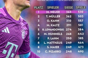 24直播网讯 德甲国家德比,拜仁2-1胜多特。门将诺伊尔迎来第530场德甲,其363胜超越穆勒,成德甲历史胜场王。同时更新德甲胜场榜前十,诺伊尔高居榜首。