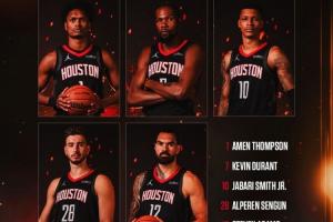 24直播网讯 NBA揭幕战,火箭将迎战雷霆。主教练乌度卡确认,球队将启用季前赛的双塔“五大”阵容首发。该阵容由阿门、杜兰特、小史密斯、申京和亚当斯组成,五人身高均超2米,首发平均身高高达2米09。