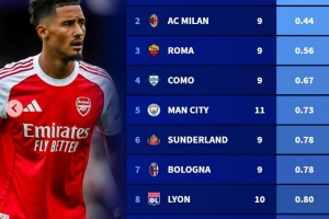 24直播网讯 德媒盘点五大联赛场均失球榜,阿森纳以11场仅丢0.27球高居榜首,展现顶级防守。AC米兰、罗马等队紧随其后,曼城、拜仁等豪门也位列前十。
