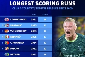新世纪五大联赛连续进球纪录:莱万14场居首,哈兰德与范尼同以12场紧随其后