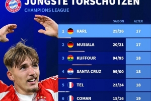 伦纳特-卡尔创造两项纪录:他成为欧冠历史上最年轻的进球拜仁球员及德国球员。