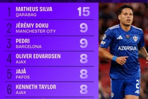 24直播网讯 欧冠联赛阶段前三轮,Squawka统计被犯规数据。卡拉巴赫后卫马修斯-席尔瓦以15次被犯规高居榜首,曼城的多库与巴萨的佩德里均9次并列第二,阿贾克斯、切尔西、阿森纳等多名球员均有8次上榜。