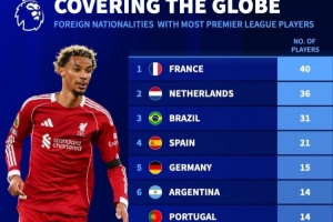 24直播网讯 英超外援中,法国球员数量最多,达40人,位居榜首。荷兰以36人紧随其后,巴西31人位列第三。西班牙、德国和阿根廷分列四至六位。数据显示,英超吸引了众多海外球员,其中法国球员在英超外援中占据主导地位。