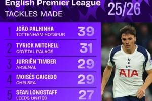 24直播网讯 英超第9轮后,热刺租将帕利尼亚以39次抢断位居本赛季英超抢断榜首位。水晶宫的米切尔以31次次之,阿森纳的廷伯与切尔西的凯塞多并列第三。该榜单在抢断次数相同时,优先考虑出场时间更少的球员。