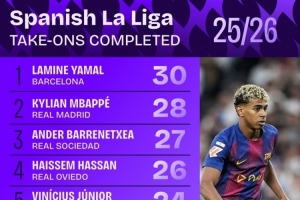 24直播网讯 根据Squawka统计,本赛季西甲成功过人榜出炉。巴萨新星亚马尔以30次成功过人高居榜首,皇马的姆巴佩以28次紧随其后。维尼修斯、尼科-威廉姆斯等知名攻击手也名列前茅。