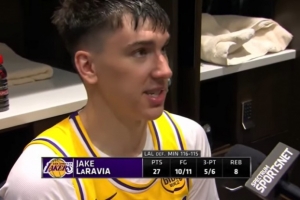 24直播网讯 湖人客场险胜森林狼,拉拉维亚赛后盛赞这场“很棒的胜利”。他提到球队在逆境中团结一致,并透露教练希望他在缺阵球员多的情况下更具攻击性。此役,拉拉维亚高效砍下27分8篮板,率队完成绝杀。
