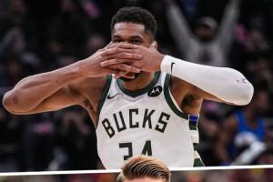 24直播网讯 NBA常规赛雄鹿121-111胜尼克斯,字母哥狂砍37分8板7助。比赛中,他复刻了阿森纳前锋的经典面具庆祝。他自幼受足球运动员父亲影响,是阿森纳球迷,最爱的球员是亨利。