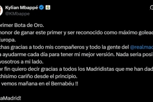 24直播网讯 皇马前锋姆巴佩获欧洲金靴后,在社媒发文感谢队友、俱乐部及球迷的支持。他称这是无比荣耀,感谢大家助其进步,并表示期待在伯纳乌与球迷见面,以“¡Hala Madrid!”结尾。