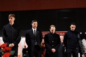 阿隆索、赫伊森、阿诺德等人前往安菲尔德纪念碑悼念若塔并献花致敬。