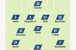 24直播网讯 巴黎欧冠将主场迎战拜仁。《队报》预测了首发阵容,包括门将舍瓦利耶、后防阿什拉夫等,中场扎伊尔-埃梅里、维蒂尼亚,以及前锋巴尔科拉、马尤卢和克瓦拉茨赫利亚。登贝莱因身体状态,其首发成疑。