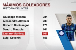 24直播网讯 意甲焦点战中国米2-0击败拉齐奥,劳塔罗建功。此球使他以161球追平传奇球星马佐拉,并列升至国米队史射手榜第4位。