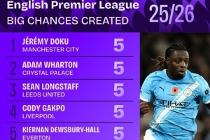 下一篇: 本赛季英超助攻榜:格拉利什、库杜斯、哈特曼4次并列居首