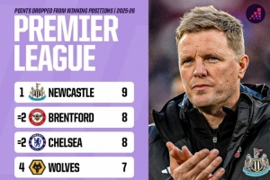 24直播网讯 根据Opta统计,本赛季英超球队在领先情况下丢分榜出炉。纽卡斯尔联以9分高居榜首,布伦特福德与切尔西同积8分并列次席。狼队丢7分,富勒姆与曼联丢6分,利兹联、水晶宫、曼城及热刺各丢5分。该数据揭示了各队在掌控比赛方面的不稳定因素。
