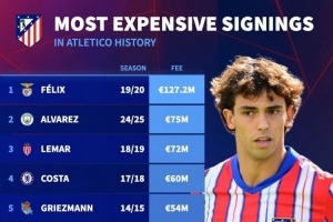 马竞队史转会费排行榜:菲利克斯以1.272亿欧位列第一,阿尔瓦雷斯(小蜘蛛)7500万欧排名第二。