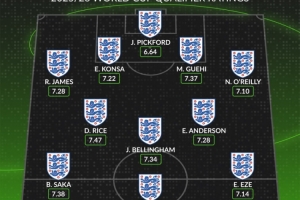 24直播网讯 英格兰世预赛8战全胜晋级世界杯。WhoScored评选出最高评分阵容,凯恩以7.96分居首,赖斯、萨卡紧随其后。该阵容包括门将皮克福德,后卫詹姆斯、孔萨等,以及中场赖斯、贝林厄姆和前锋萨卡。