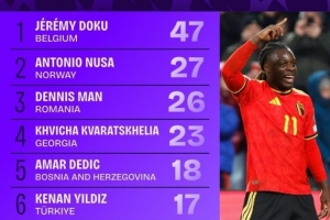 24直播网讯 世欧预小组赛过人榜出炉,比利时新星多库以47次成功过人高居榜首,优势明显。挪威的努萨和罗马尼亚的曼分列二、三位。该数据直观展现了本届赛事中球员的突破能力。