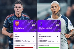 24直播网讯 英超北伦敦德比在即,数据对比显示热刺前锋里沙利松在射门、进球、转化率及过人等关键数据上,均优于阿森纳的约克雷斯。两队创造机会和造犯规次数持平,里沙利松状态更为出色,备受期待。