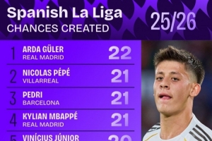 24直播网讯 Squawka统计显示,皇马新星居勒尔以22次创造机会次数领跑西甲。紧随其后的分别是比利亚雷亚尔的佩佩与巴萨的佩德里,两人均创造21次机会。皇马的姆巴佩和维尼修斯分列第四、五位。此榜单展现了本赛季西甲球员在进攻端的创造力。