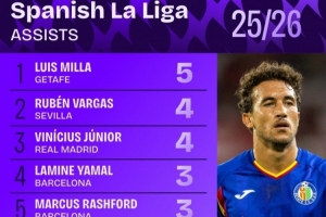 24直播网讯 根据Squawka统计,本赛季西甲助攻榜排名出炉。赫塔费球员路易斯-米拉以5次助攻暂列榜首。皇马前锋维尼修斯与塞维利亚的巴尔加斯同以4次助攻并列第二。巴塞罗那新星亚马尔、曼联前锋拉什福德以及皇马小将居勒尔则同以3次助攻并列第四。